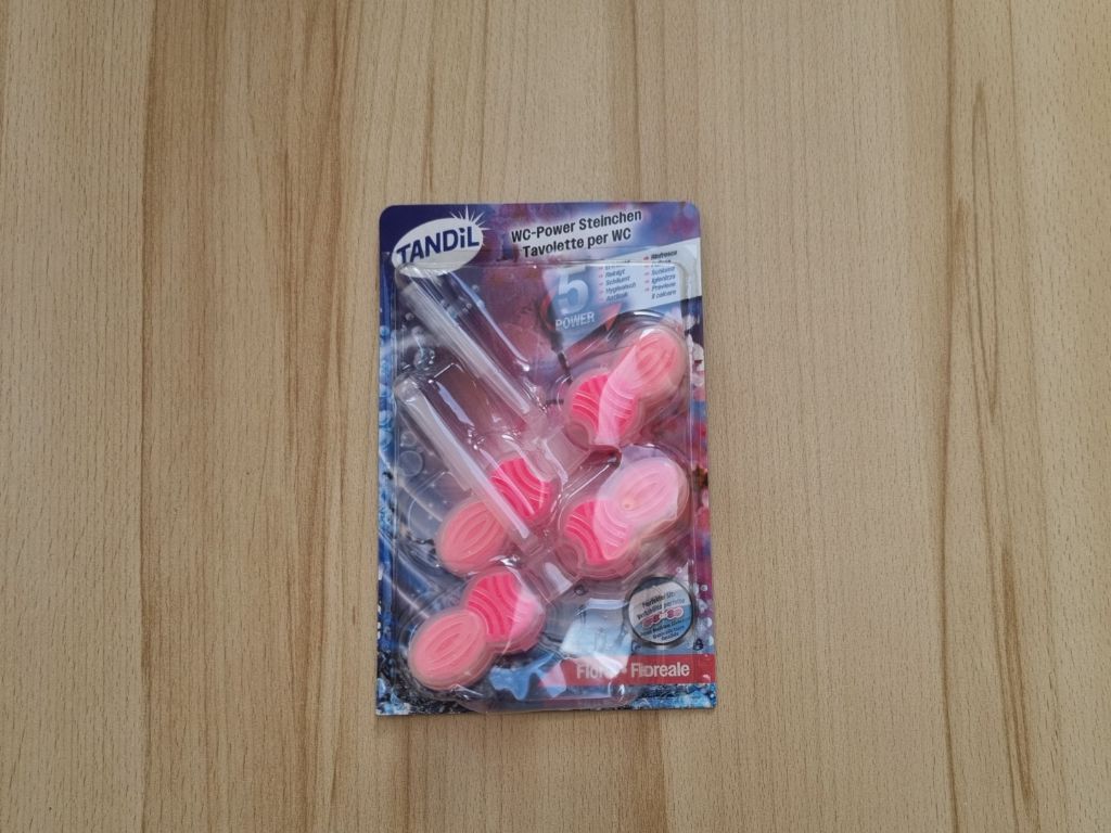 제가 사용한 제품은 Hofer(호퍼)에서 구입한 TANDIL WC Power-Steinchen, Floral인데요, 고체 블록 형태의 세정제가 플라스틱 걸이에 고정되어 있습니다. 사용법은 아주 간단해서, 변기 안쪽 물이 흐르는 부분에 걸이만 끼워주면 끝이에요. 손에 세정제가 묻을 걱정도 없고, 복잡한 설치 없이 바로 사용할 수 있어 처음 사용하시는 분도 전혀 부담이 없습니다.
